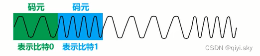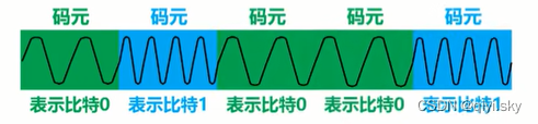 图示这两段波形,是构成该信号的基本波形,我们可称其为码元。它们可以表示比特0,也可以表示比特1。