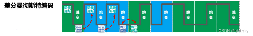 在每个码元时间的中间时刻,信号都会发生跳变;例如负跳变表示比特1,正跳变表示比特0。