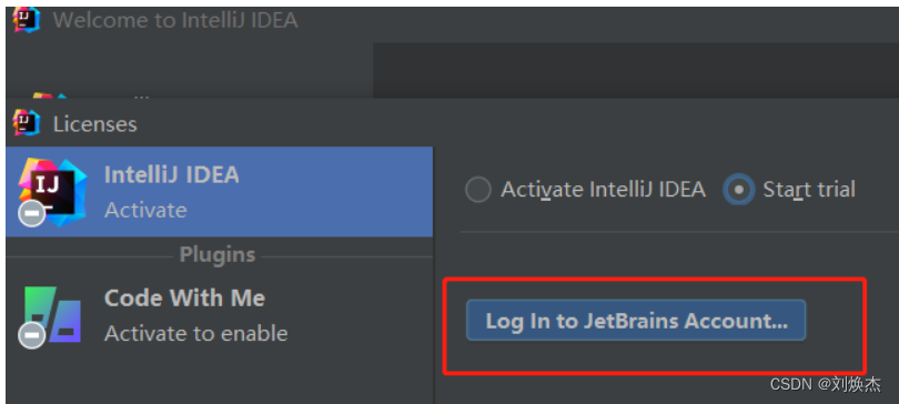 16.选择Start trial,点击“Log In to JeBrains Account...”