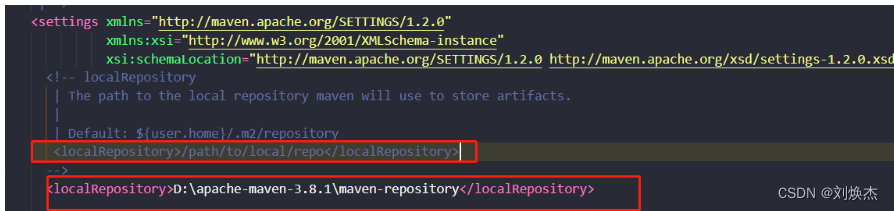 将 <localRepository>/path/to/local/repo</localRepository>(应该在第53行左右)复制出来单独在下面写自己的路径