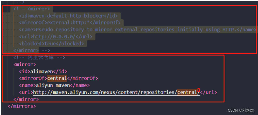 <!-- 阿里云仓库 --> <mirror> <id>alimaven</id> <mirrorOf>central</mirrorOf> <name>aliyun maven</name> <url>http://maven.aliyun.com/nexus/content/repositories/central/</url> </mirror>