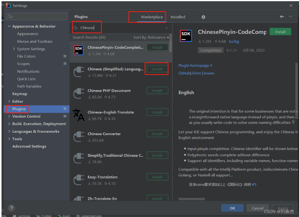 2.点击Plugins(插件)→在搜索框输入Chinese,然后找到 Chinese (Simplified) Language (汉化插件),等待下载完→Install (安装): (注意:要确保你的搜索框是Marketplace,和版本2020.1以后的,否则搜不到!)