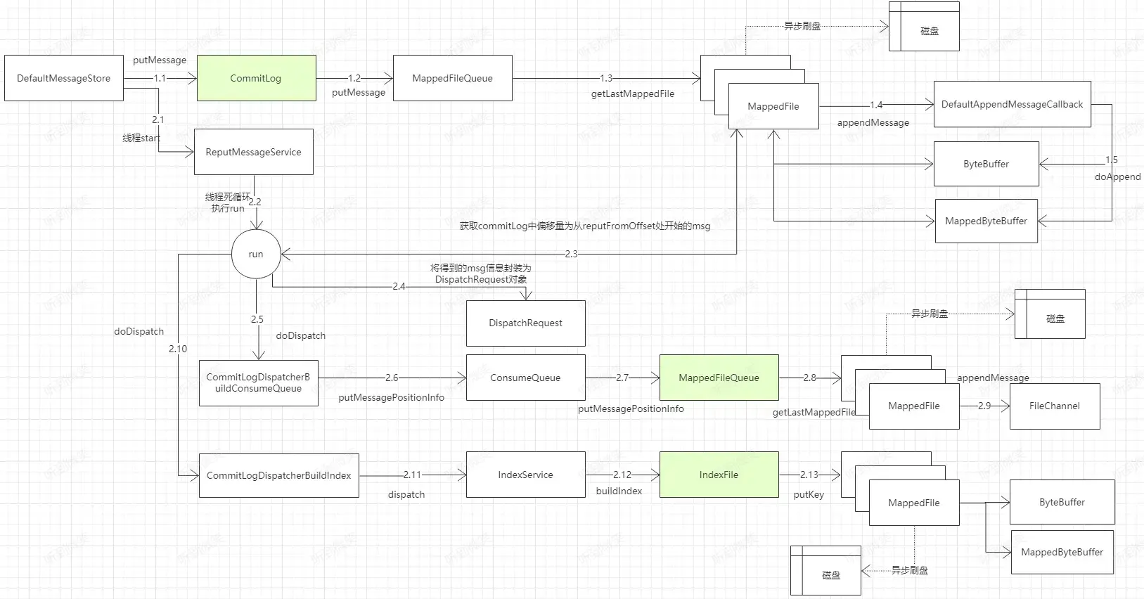 - 异步刷盘时,消息写入PageCache就会响应ACK,然后由后台线程异步将PageCache里的内容持久化到磁盘,降低了读写延迟,提高了性能和吞吐量。服务宕机消息不丢失(操作系统会完成内存映射区域的刷盘),机器断电少量消息丢失。
