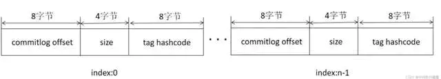 ,同一个队列中存在多个消息文件。ConsumeQueue 的设计极具技巧,每个条目长度固定(8字节CommitLog物理偏移量、4字节消息长度、8字节tag哈希码)。这里不是存储tag的原始字符串,而是存储哈希码,目的是确保每个条目的长度固定,可以使用访问类似数组下标的方式快速定位条目,极大地提高了ConsumeQueue文件的读取性能。消息消费者根据topic、消息消费进度(ConsumeQueue逻辑偏移量),即第几个ConsumeQueue条目,这样的消费进度去访问消息,通过逻辑偏移量logicOffset×20,即可找到该条目的起始偏移量(ConsumeQueue文件中的偏移量),然后读取该偏移量后20个字节即可得到一个条目,无须遍历ConsumeQueue文件。