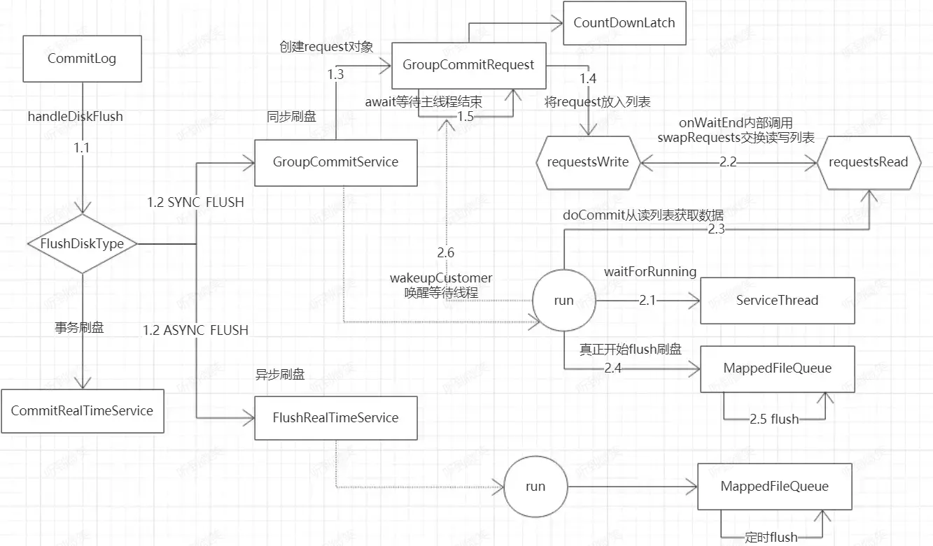 同步刷盘也是生产者-消费者模型。broker保存消息到MappedFile后,创建GroupCommitRequest请求放入列表,并阻塞等待。后台线程从列表中获取请求并刷新磁盘,成功刷盘后通知等待线程。