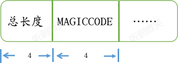 围绕着一条消息,还会存储许多其它内容,我们在这里只需要了解前两位是 4 字节的总长度和 4 字节的 MAGICCODE 即可: