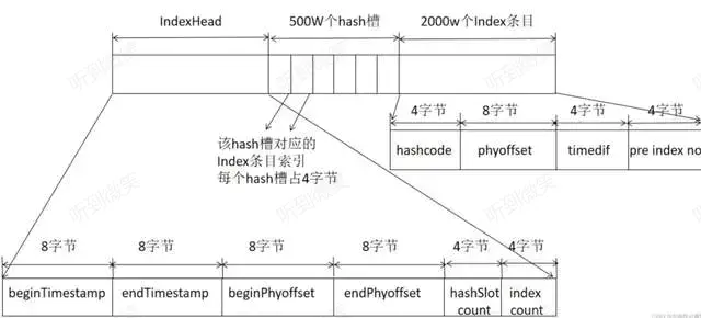 Index文件基于物理磁盘文件实现哈希索引。Index文件由40字节的文件头、500万个哈希槽、2000万个Index条目组成,每个哈希槽4字节、每个Index条目含有20个字节,分别为4字节索引key的哈希码、8字节消息物理偏移量、4字节时间戳、4字节的前一个Index条目(哈希冲突的链表结构)。