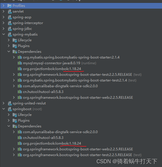 这个注解后,子项目中lombok依赖版本就变成了1.18.12。然后接口就还报那个错误!把依赖注释掉,子项目中lombok依赖版本继承父项目版本为1.18.24,接口可以调通;但是过一会 我把子项目中lombok依赖又加上,发现lombok的版本又不会改变了(1.18.24),刷新maven、重启idea还是不会变!这他娘的让我摸不着头脑!真奇葩啊!