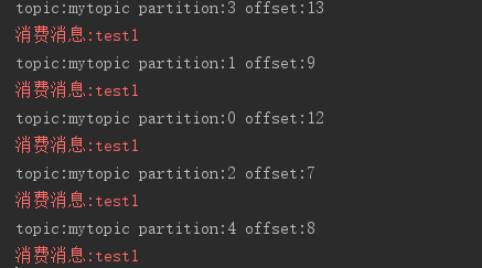 在自定义分区策略前,先看下kafka默认是怎么的,访问http://localhost:8080/send1?message=test1,看下打印结果: