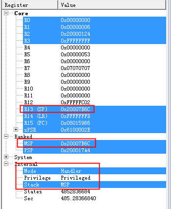 这意味着同一个逻辑地址,实际上有两个物理寄存器,一个为MSP,一个为PSP,在不同的工作模式调用不同的物理寄存器