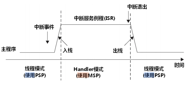 2)使用OS时(如UCOSII): main函数和中断使用MSP; 各个Task(线程)使用PSP(即任务栈);