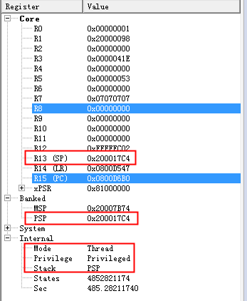 带操作系统运行任务的时候R13值与PSP相同,内核使用PSP