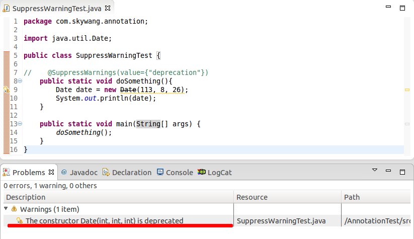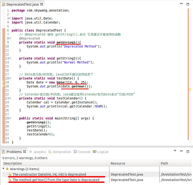 (01) 关于 @SuppressWarnings 和 @Deprecated,已经在"第3部分"中详细介绍过了。这里就不再举例说明了。