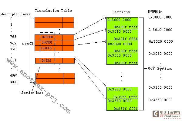 假设现在执行指令MOV REG, 0x30000012,虚拟地址的二进制码为00110000 00000000 00000000 00010010,前12位是Descriptor Index= 00110000 0000=768,故在Translation Table里面找到第768号描述符,该描述的Section Base Address="0x0300",也就是说描述符所描述的虚拟段(页)所映射的物理段(页框)的首地址为0x3000 0000(物理段(页框)的基地址=Section Base Address左移20bit=0x0300<<20=0x3000 0000),而Offset=000000 00000000 00010010=0x12,故虚拟地址0x30000012映射成的物理地址=0x3000 0000+0x12=0x3000 0012(物理页框基地址+虚拟地址中的偏移)。你可能会问怎么这个虚拟地址和映射后的物理地址一样?这是由我们定义的映射规则所决定的。在这个例子中我们定义的映射规则是把虚拟地址映射成和他相等的物理地址。我们这样书写映射关系的代码:
