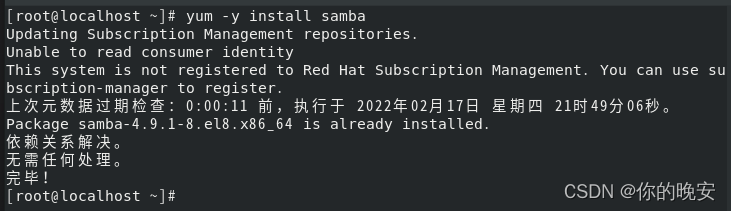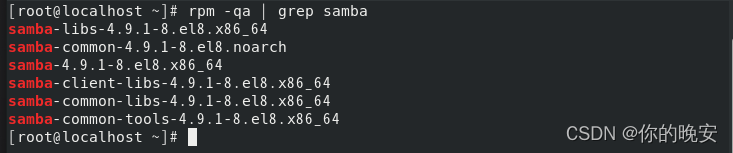 [root@localhost ~]# yum -y install samba //安装Samba服务 [root@localhost ~]# rpm -qa | grep samba //检测系统中是否安装了Samba服务