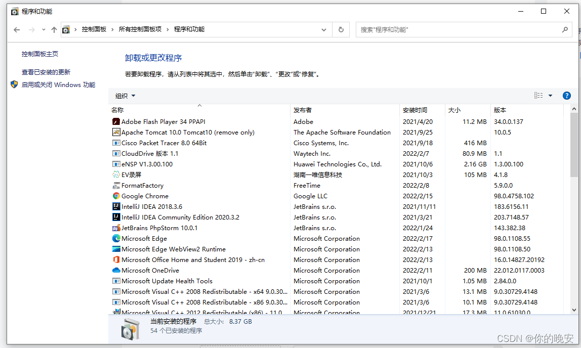 进入程序和功能,点击启用或关闭Windows功能