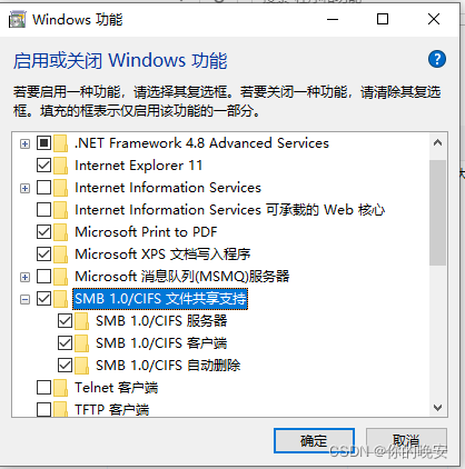 找到SMB 1.0/CIFS文件共享支持,一般打开之后会重启电脑