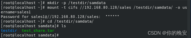[root@localhost ~]# mount -t cifs //192.168.80.128/sales /testdir/samdata/ -o username=sales1