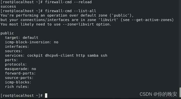 [root@localhost ~]# firewall-cmd --reload //重新加载防火墙