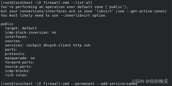 [root@localhost ~]# firewall-cmd --permanent --add-service=samba //添加放行服务samba