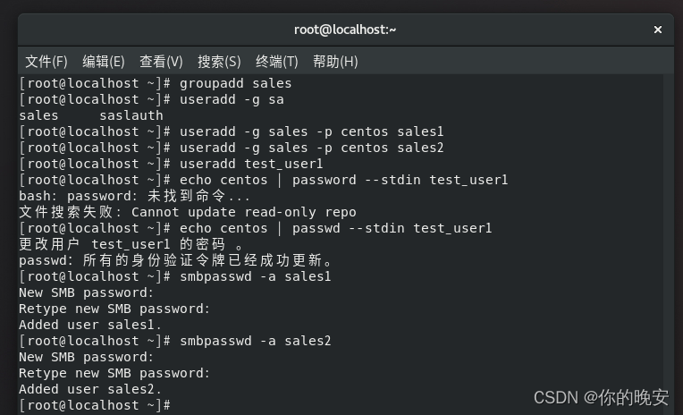 [root@localhost ~]# touch /companydate/sales/test_share.tar(2).添加销售部用户和组并添加相对应的Samba账户、