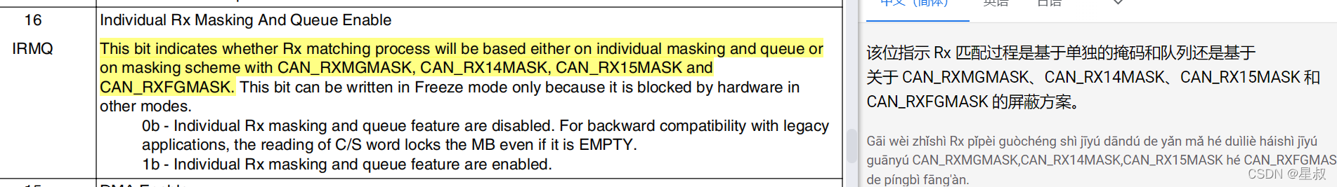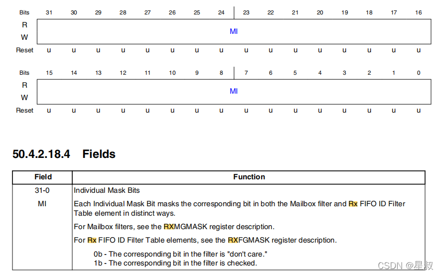 即,每个邮箱都有一个单独的RXIMR(Rx Individual Mask Registers),根据相应的ID长度选配需要设置的过滤掩码。