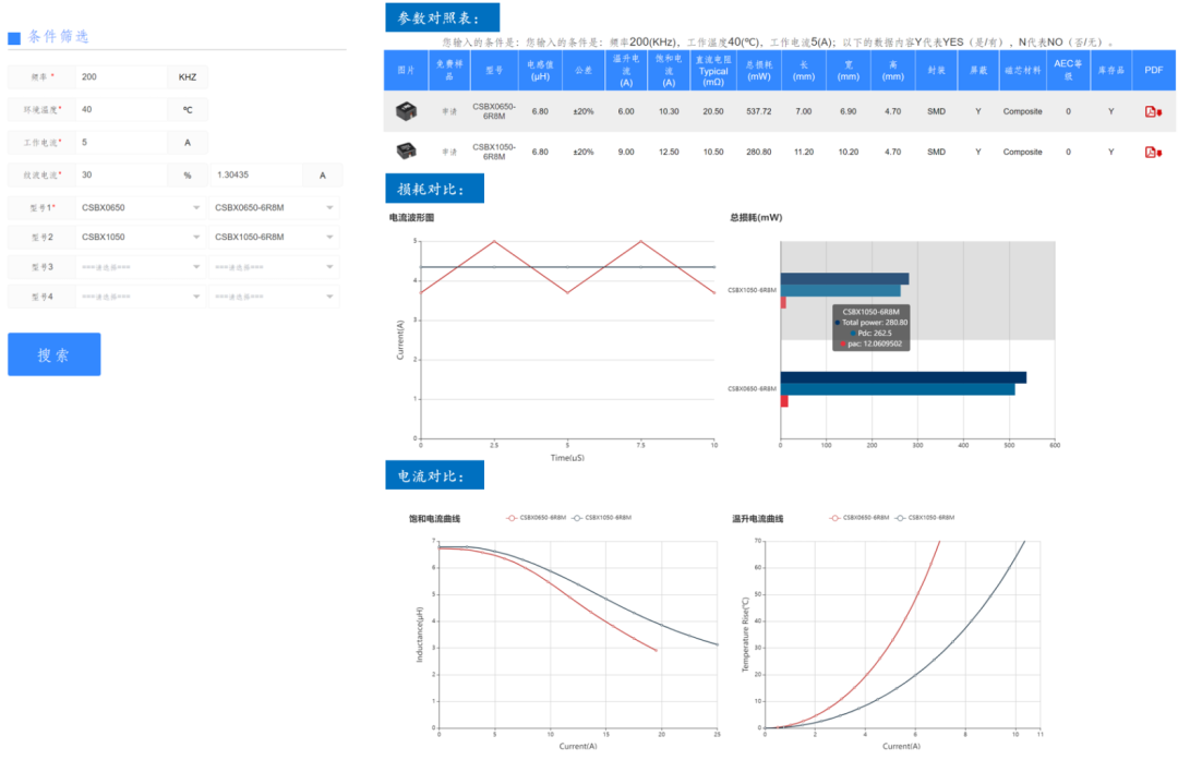 使用这个工具非常简单,按照给定的工作条件选择对应需要的CODACA电感料号,再点击“搜索”即完成计算并返回:参数对照表(同时最多对比4项型号),损耗对比,饱和电流曲线和温升电流曲线,如下图(Fig.4 )所示: