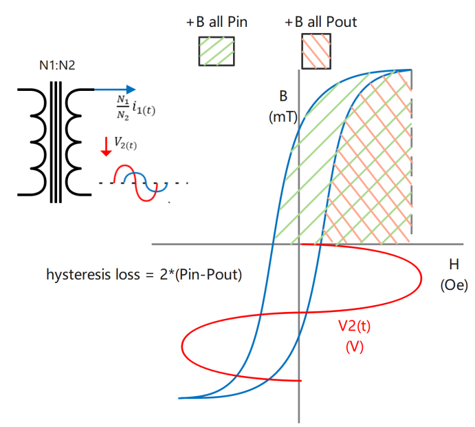 Fig.3磁芯损耗的测试原理:系统功率输入与功率输出的差值部分大致相当于磁滞损耗(B-H曲线闭合区域内)