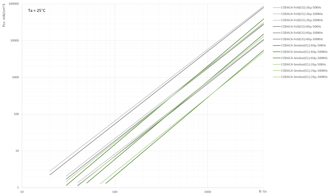以下是CODACA自制的Sendust磁芯和FeSi磁芯的损耗曲线(如下图Fig.3 ),科达嘉自制磁芯主要用于组装自己的电感产品系列,目前已经开发出非常多低损耗材质系列,为提高电源的转换效率、降低系统热耗散压力提供了更多优化的选择。