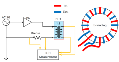 铜线的损耗此处不再赘述,这里主要来看一下磁芯损耗的测量。上个篇幅已经提到为了测量磁通密度而使用B-H特性测试仪来搭建了测试平台(如图Fig.2),实际上测量磁芯的损耗可以直接用本测试平台来完成。