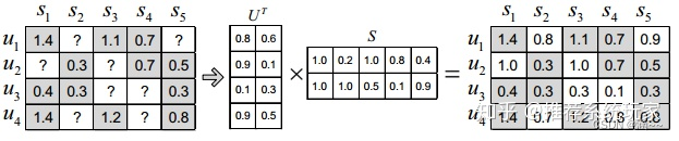首先来概括的说下矩阵分解的原理。 上图中每一行u uu代表每个用户,每一列s ss代表每个物品,矩阵中的数字代表着用户对物品的打分。?代表着用户没有给这个物品打过分。在实际数据中,我们通过数据构建的矩阵如上图一样并不是一个全部有评分的矩阵。在Netflix真实的数据集里,矩阵的稠密度仅有3%左右。那么就意味着,矩阵中有绝大部分的评分是空白的。如何得到这些空白的评分呢?矩阵分解的就是为了解决这个问题。