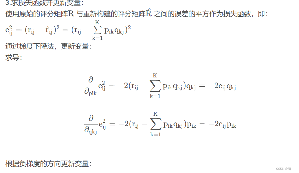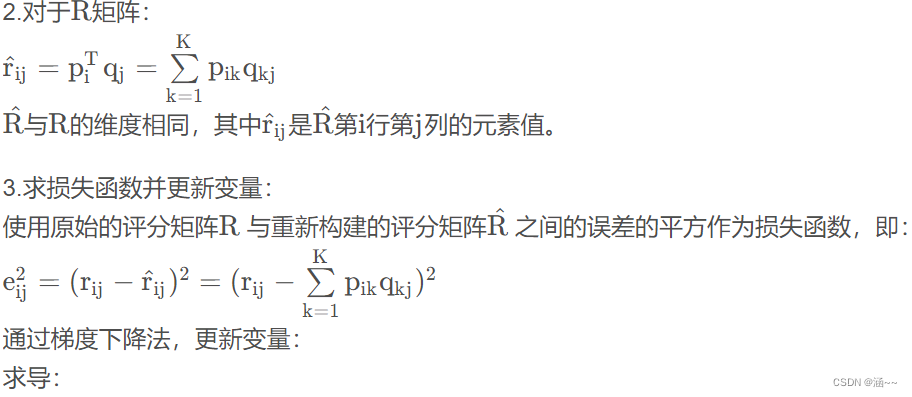用大白话总结一下,矩阵分解的目的就是通过分解之后的两矩阵内积,来填补缺失的数据,用来做预测评分。矩阵分解的核心是将矩阵分解为两个低维的矩阵的乘积,分别以k kk维的隐因子向量表示,用户向量和物品向量的内积则是用户对物品的偏好度,即预测评分。值得注意的是k kk的选取是通过实验和经验而来的,因此矩阵分解的可解释性不强。