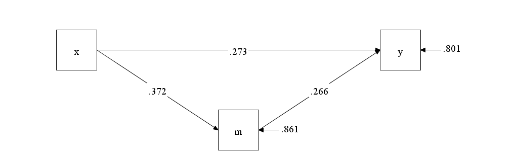 由下图可知:显变量模型中,X、M到Y的路径显著,X到M的路径显著