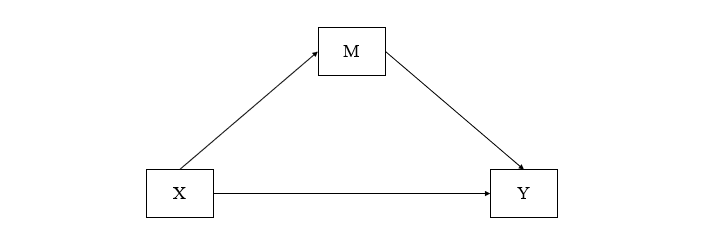最简单的中介模型,如下图所示,涉及到一个自变量X、一个中介变量M、一个因变量Y,我们想要知道X是否通过M进而对Y产生影响,或者说M是否中介了X对Y的影响。