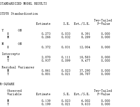 OUTPUT: SAMPSTAT STDYX MOD CINTERVAL; ! 输出样本统计量、标准化值、修正系数、置信区间