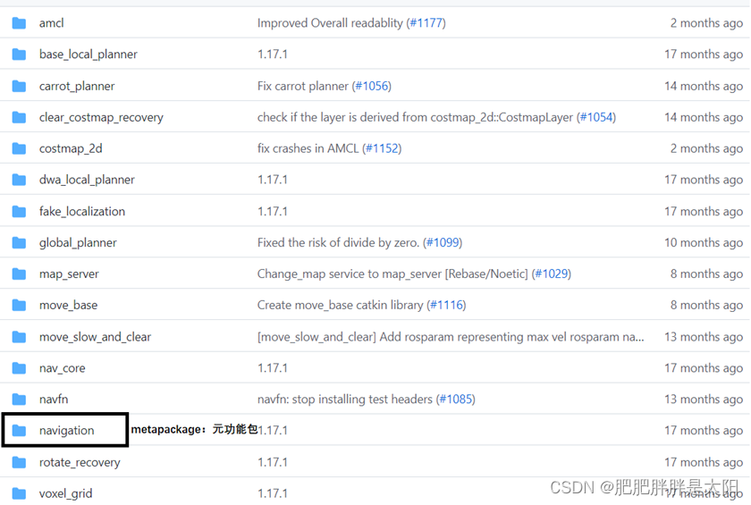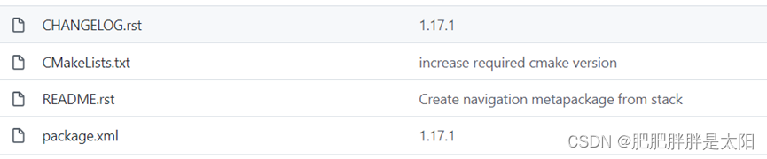 上述图片中显示了导航模块的所有功能包,其中navigation功能包为元功能包(metapackage),元功能包中由于没有src目录因此无需添加任何依赖项,因为这个功能包没有自己的专属功能,它的功能是借助其他的功能包的功能来实现的。元功能包有两个文件即可: