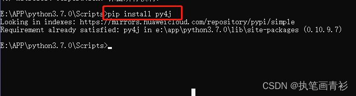 2.cmd进入目录(python环境下的Scripts)E:\APP\python3.7.0\Scripts,运行pip install py4j安装py4j库。如图所示: