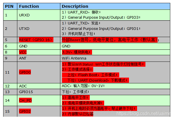 针脚图(悬空8个针脚的)不太确定旧型号:https://wiki.ai-thinker.com/_media/esp8266/esp8266_module_list.png运行模式(GPIO0引脚悬空或者置高才能正常工作.)烧录模式:(GPIO0接地)https://wiki.ai-thinker.com/esp_download烧录完成后要把GPIO0引...