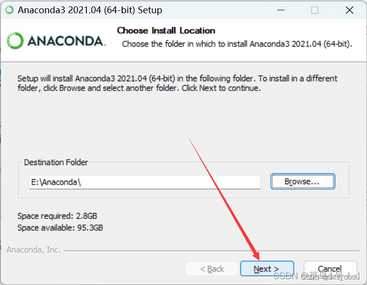 我是在E盘建立了一个新的文件夹,E:\Anaconda,注意这个文件夹不要使用中文或者空格、特殊字符。选择对应安装目录,点next。