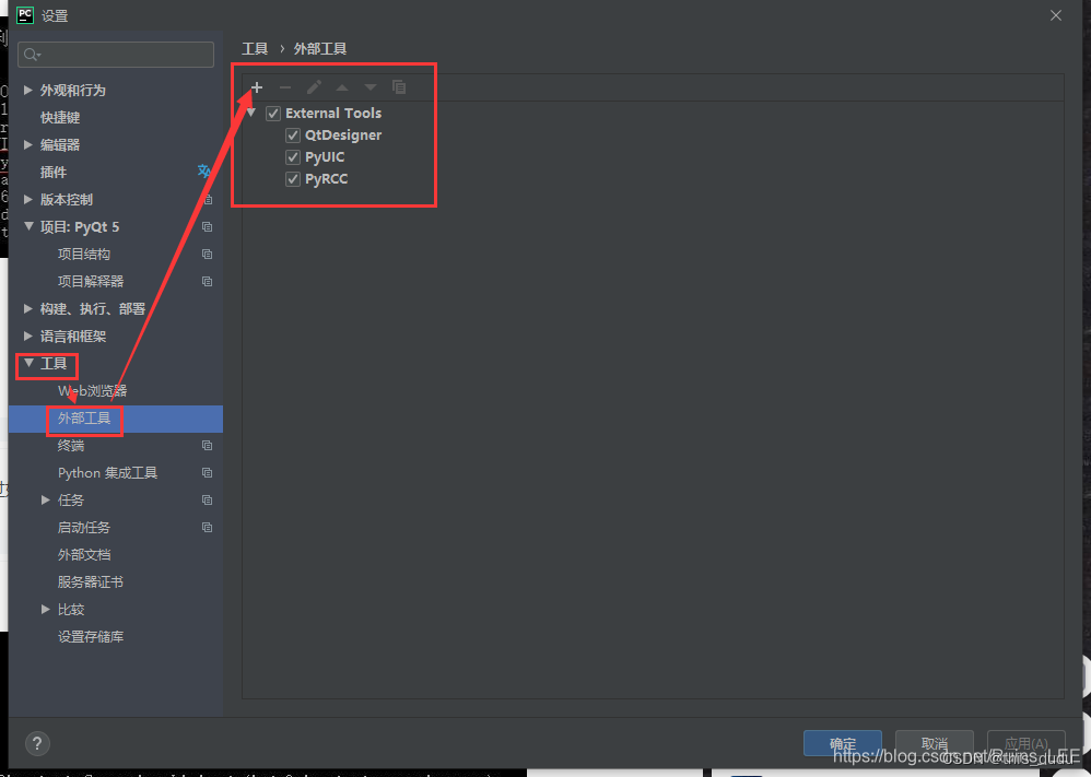 按顺序点击“文件->设置->工具->外部工具->箭头指向的’+'号”,如下图所示。