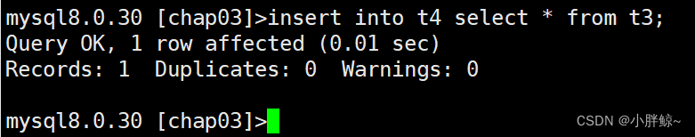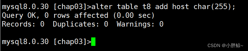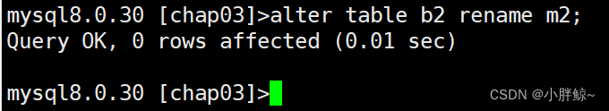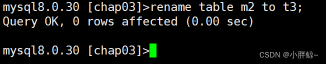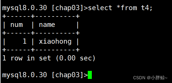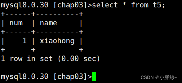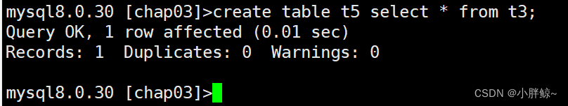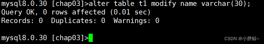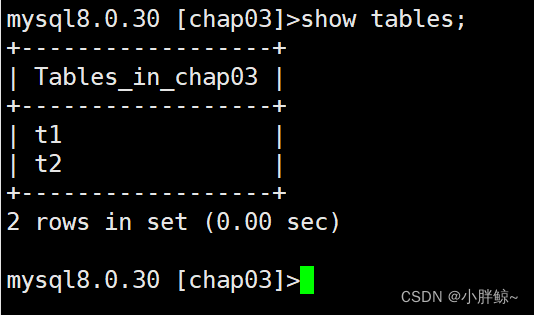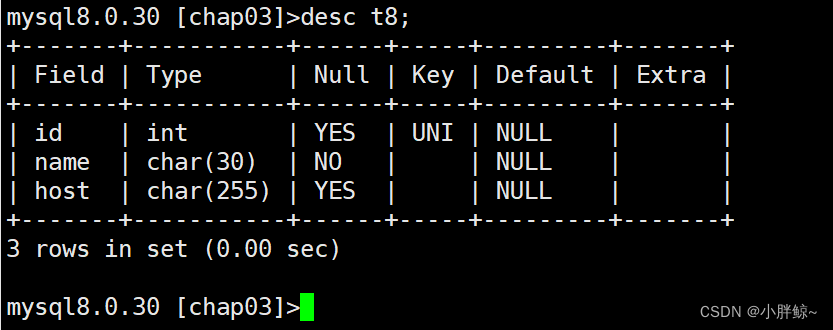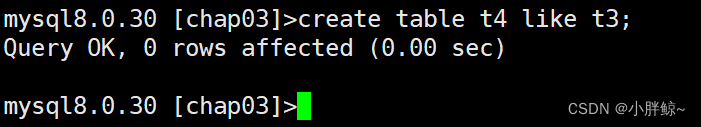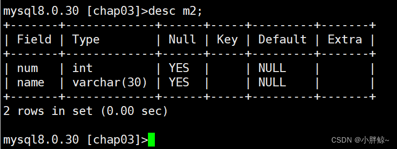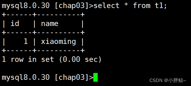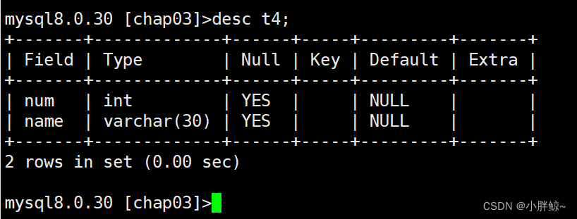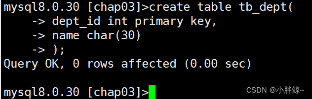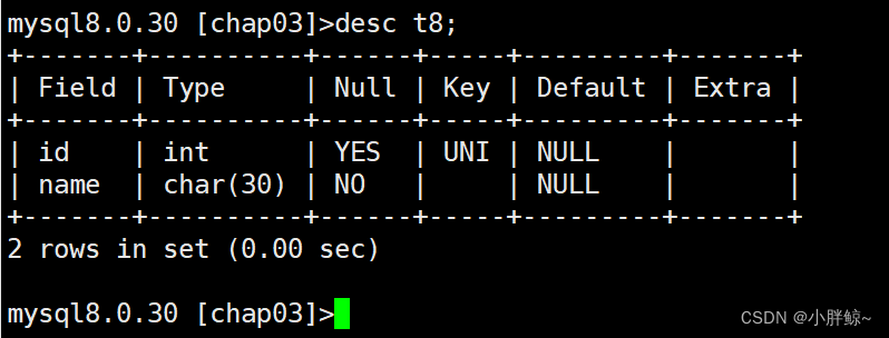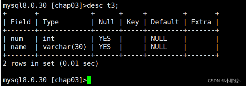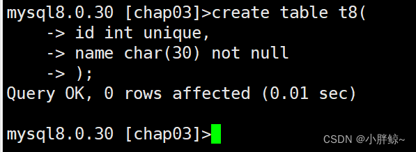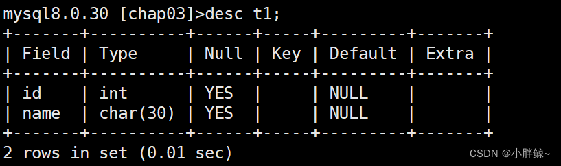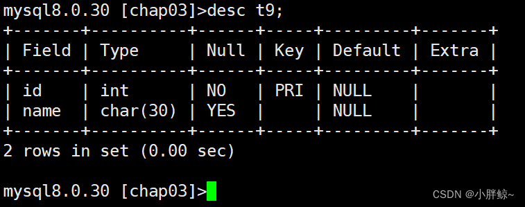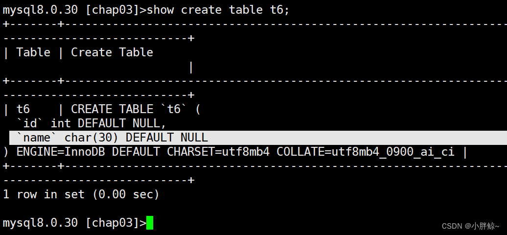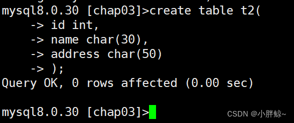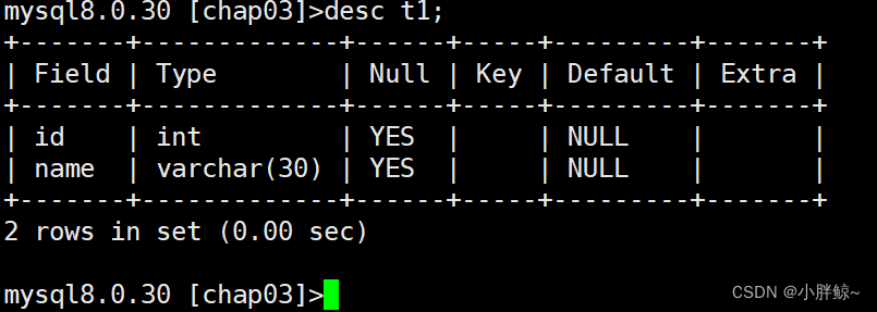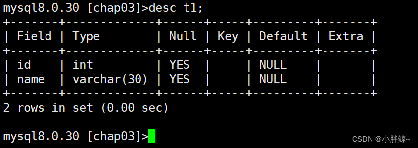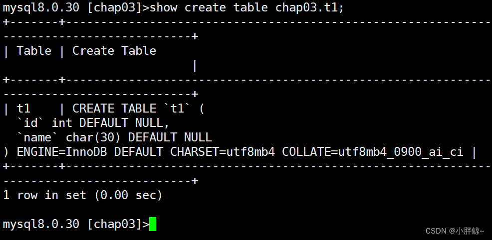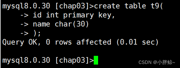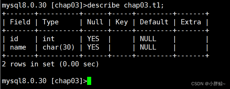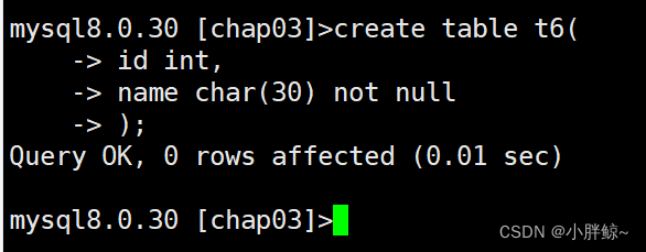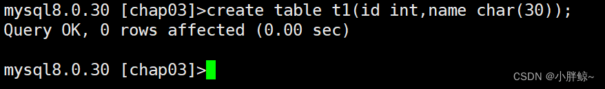 mysql8.0.30 [chap03]>create table t1(id int,name char(30));