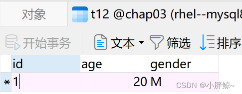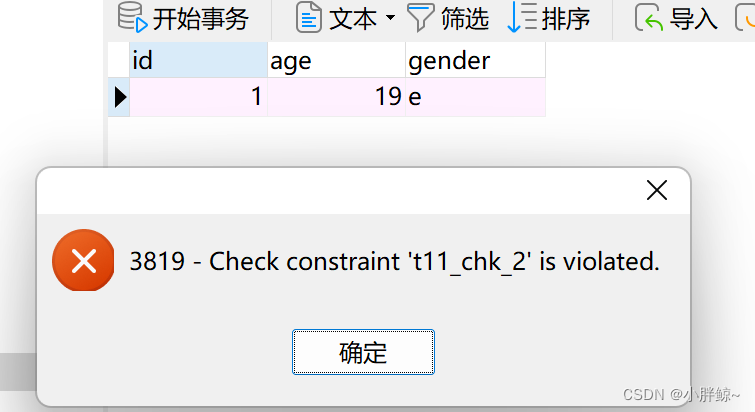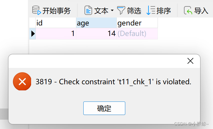 (1)创建表t对age进行约束,即只能输入大于18的数字;对gender进行约束,即只能输入M,F