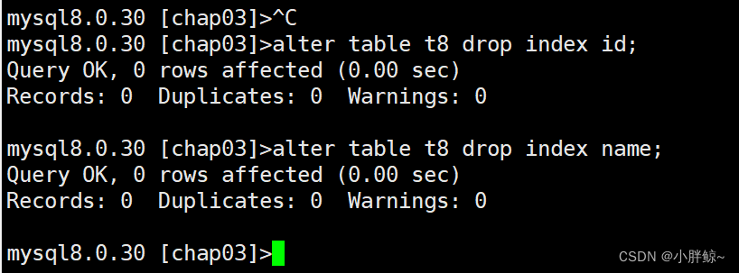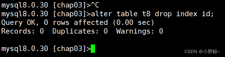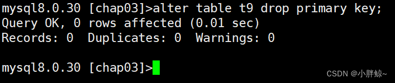 mysql8.0.30 [chap03]>alter table t9 drop primary key;