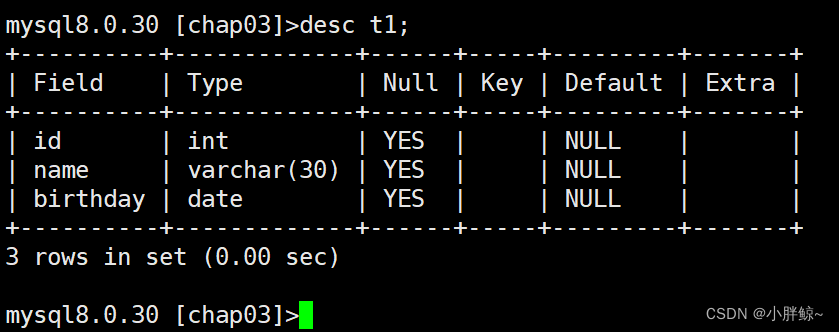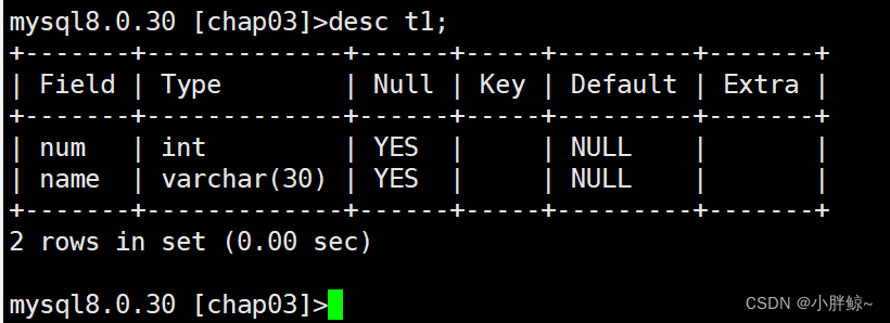 mysql8.0.30 [chap03]>describe chap03.t1;