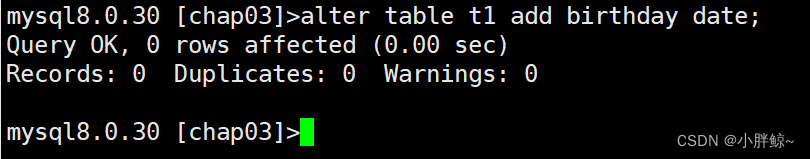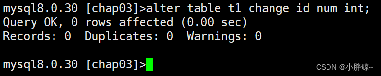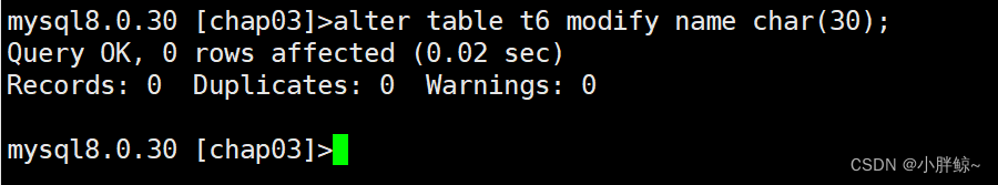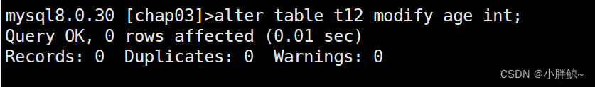 mysql8.0.30 [chap03]>alter table t12 modify age int;