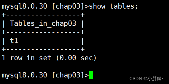 (4)创建t1表的结果如下,查看chap03数据库下的所有表可以看到表t1