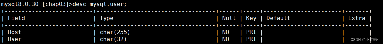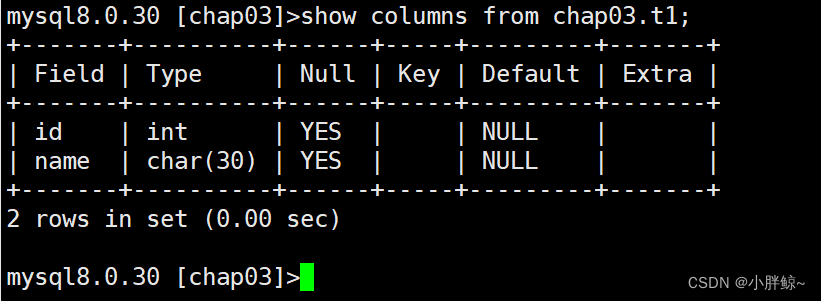 mysql8.0.30 [chap03]>show columns from chap03.t1;