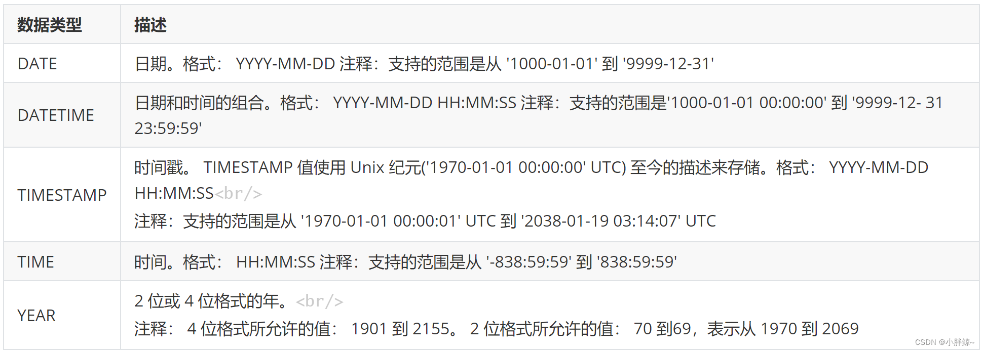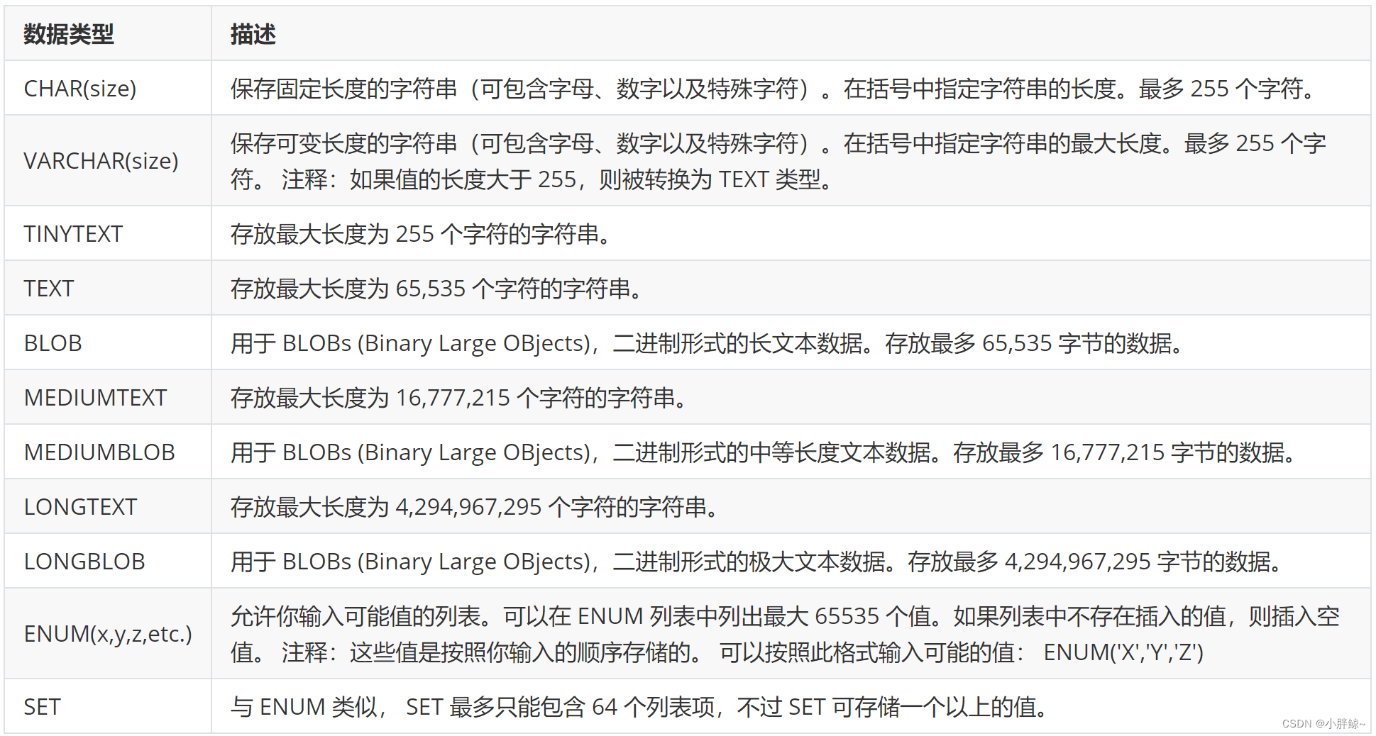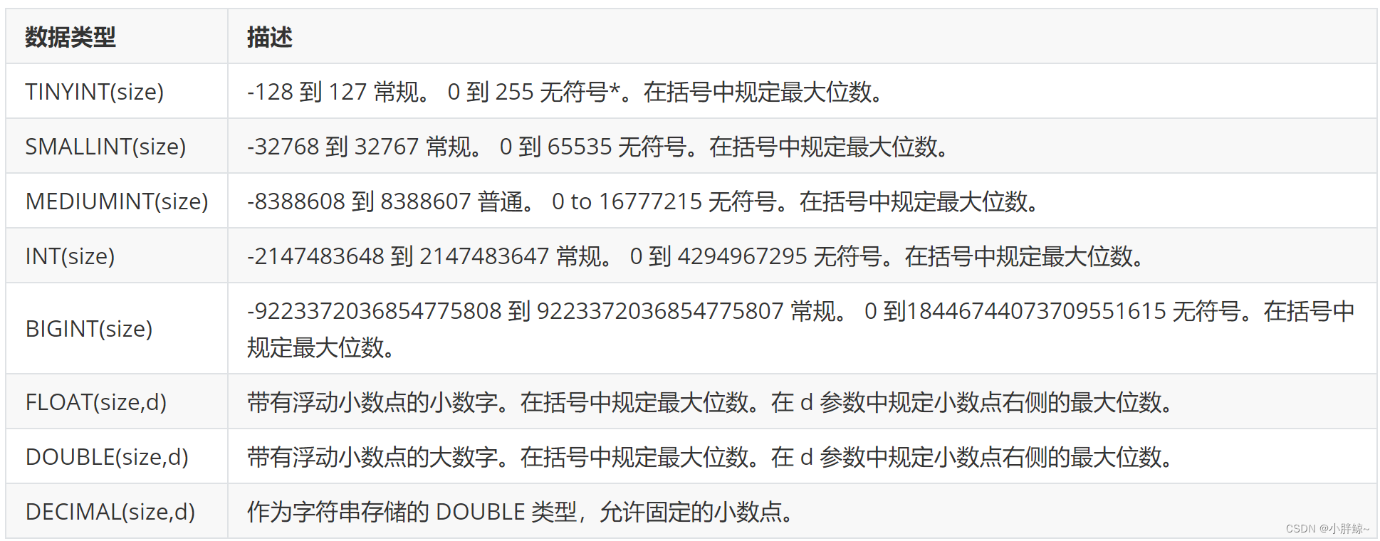 注意:这些整数类型拥有额外的选项 UNSIGNED。通常,整数可以是负数或正数。如果添加 UNSIGNED属性,那么范围将从 0 开始,而不是某个负数。