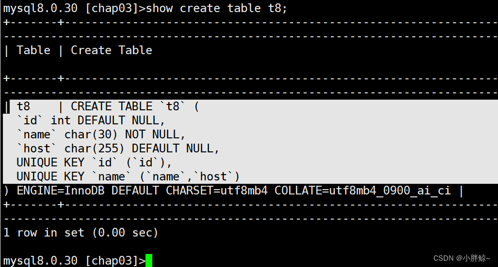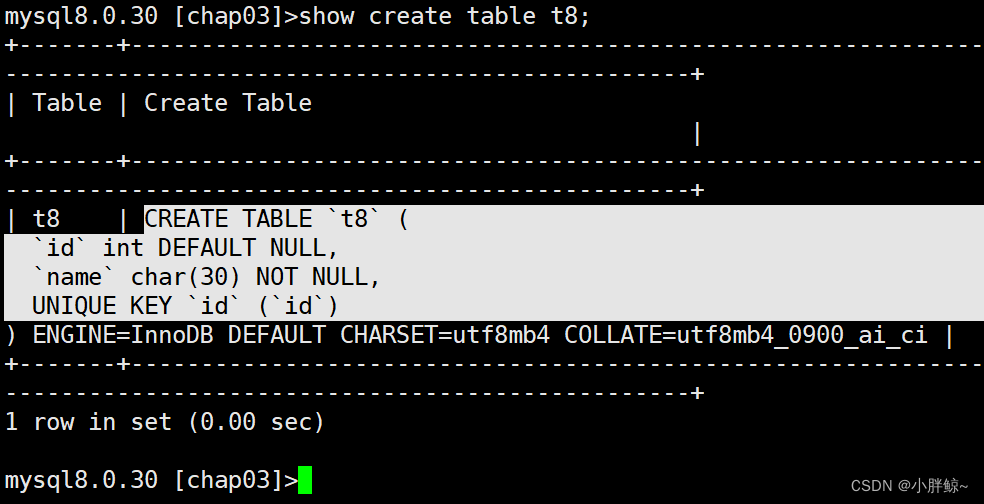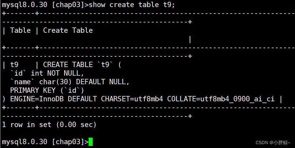 mysql8.0.30 [chap03]>show create table chap03.t1;