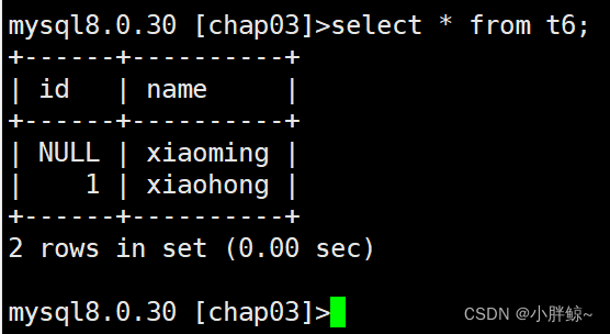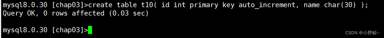 mysql8.0.30 [chap03]>create table t10( id int primary key auto_increment, name char(30) );